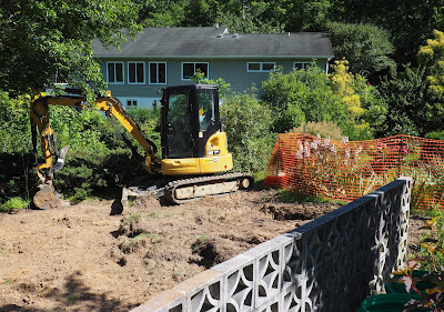 Stationed near the edge of the ravine is a small backhoe. The shed used to sit behind the decorative concrete block wall, but has been moved out of the way. It will eventually be put where the small backhoe is sitting.